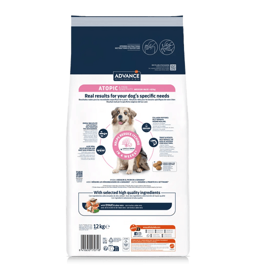 ADVANCE VETERINARY DIETS Atopic Medium/Maxi è un alimento dietetico completo per cani adulti e cuccioli di più di 4 mesi di taglia media e grande, formulato per prendersi cura della pelle in caso di dermatite e perdita eccessiva di pelo, nonché per ridurre le intolleranze a ingredienti e nutrienti.