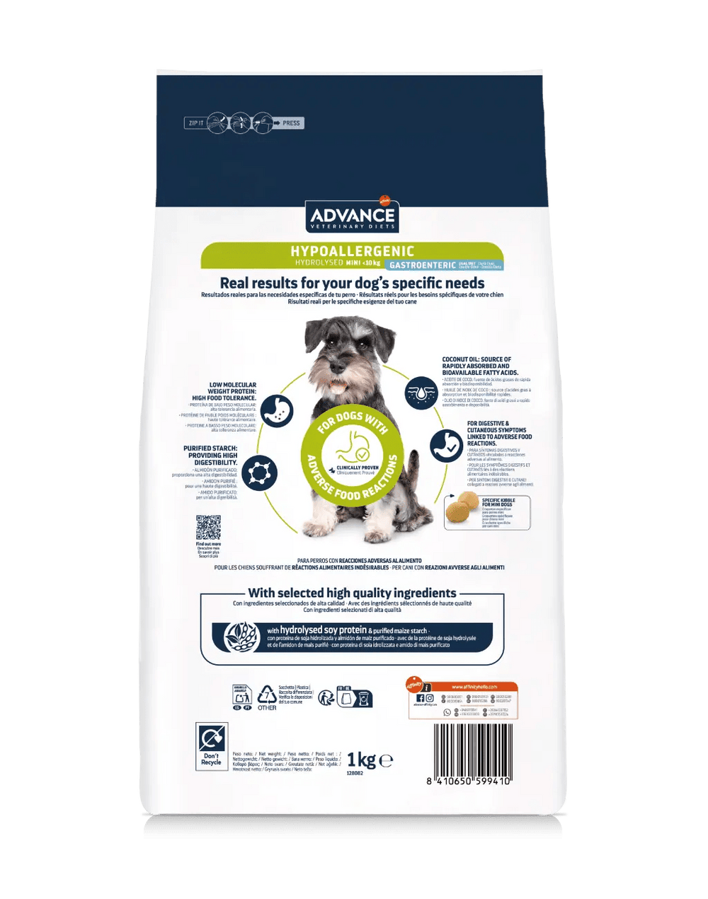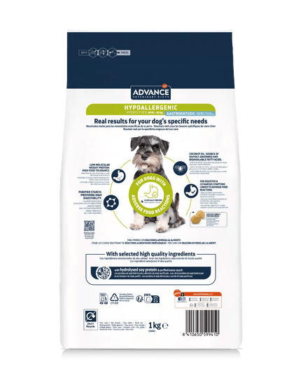 ADVANCE VETERINARY DIETS Hypoallergenic Mini è un alimento dietetico completo clinicamente provato per cani adulti di taglia mini, indicato per la riduzione di intolleranze a ingredienti e nutrienti.