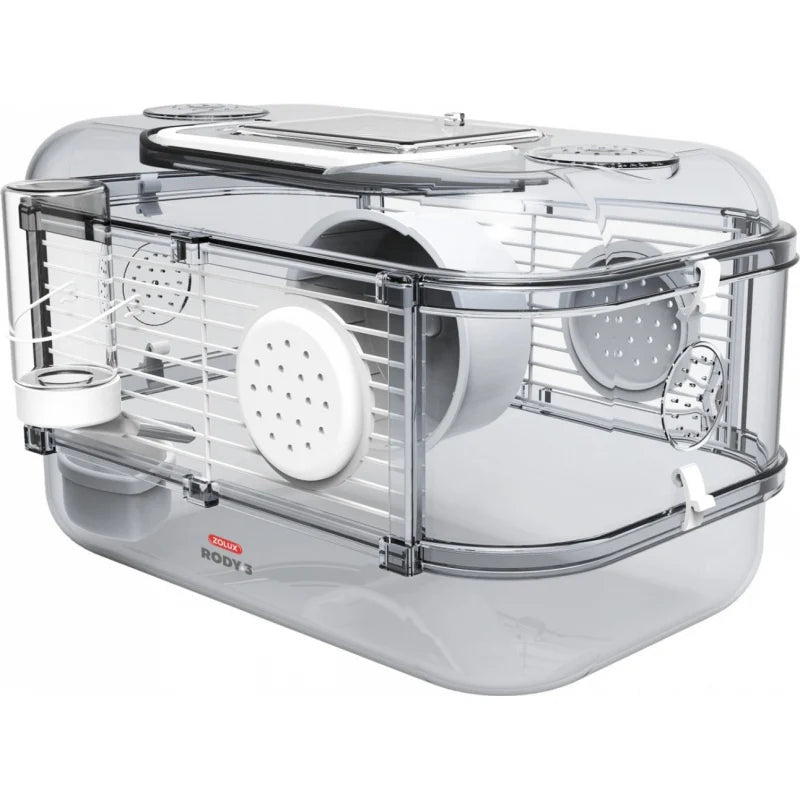 Con il suo plastico leggermente fumé, questa nuova versione delle gabbie evolutive di, goda di un fondo e di un coperchio della gabbia più pratici! La Rody3 Mini è completamente attrezzata: ciò include una ruota, 1 bottiglia, 1 ciotola e 2 tappi.