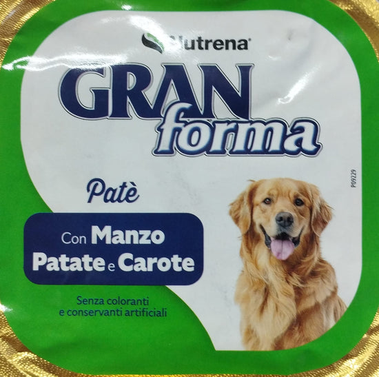 Nutrena ha ideato Granforma Dog Paté Manzo, Patate e Verdure, una gustosa ricetta senza conservanti e coloranti. Con manzo (4%), patate (4%) e carote (4%), come fonte di fibre vegetali, importanti per il buon funzionamento dell’organismo del vostro cane ed il suo corretto mantenimento.