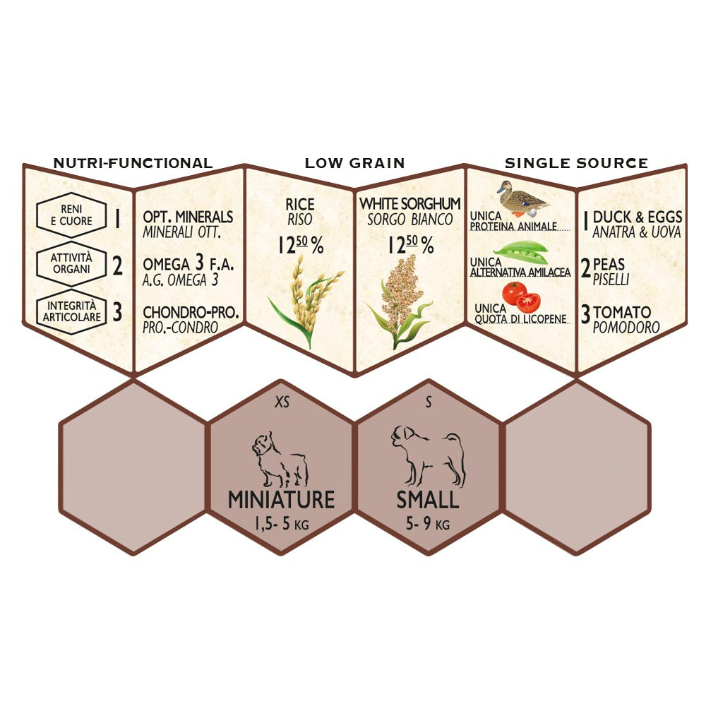 Piselli (38%), riso (12,5%), sorgo bianco (12,5%), polpa di barbabietola essiccata, grasso animale, proteine di anatra disidratate (6%), olio di pesce, lievito di birra, uova (2%), proteine animali idrolizzate, semi di lino, polpa di pomodori essiccata (1%), polpa di arancia essiccata (1%), carote essiccate, polpa di mele essiccata, cloruro di potassio, glucosamina (0,1%), solfato di condroitina (0,08%), miele (0,04%), fiori di arancio essiccati (0,02%).
