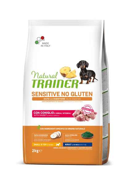 Coniglio 13%, granturco integrale 12%, proteina di granturco, fioretto di granturco, piselli disidratati, proteine disidratate di coniglio 8%, farinaccio di riso, grasso di origine animale, ceci disidratati, riso integrale 4%, semi di lino* 2,6%, aroma senza proteine animali, sostanze minerali, olio di granturco, riso, concentrato secco di radice di cicoria (fonte di inulina)* 0,8%, lignocellulosa, concentrato secco di gambo di ananas* 0,1%, spirulina (Arthrospira platensis)* 0,1%, alghe marine (Schizochytrium spp.)* 0,08%.