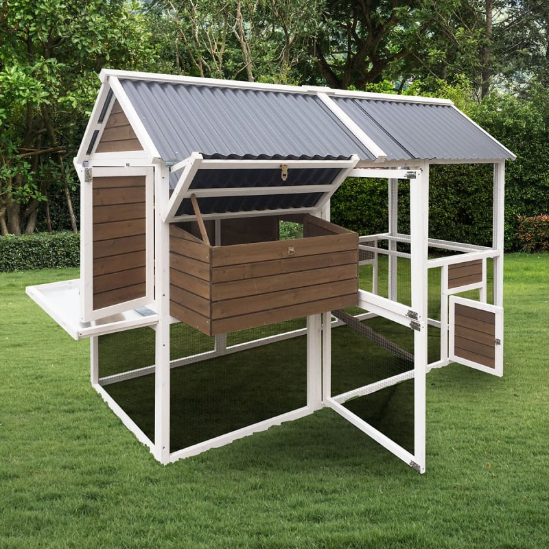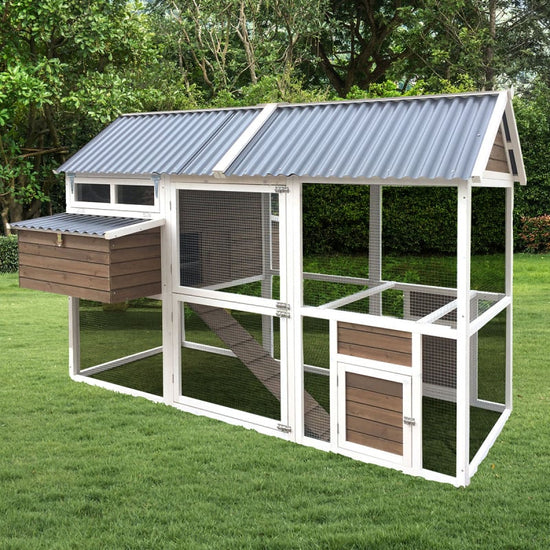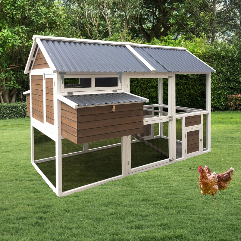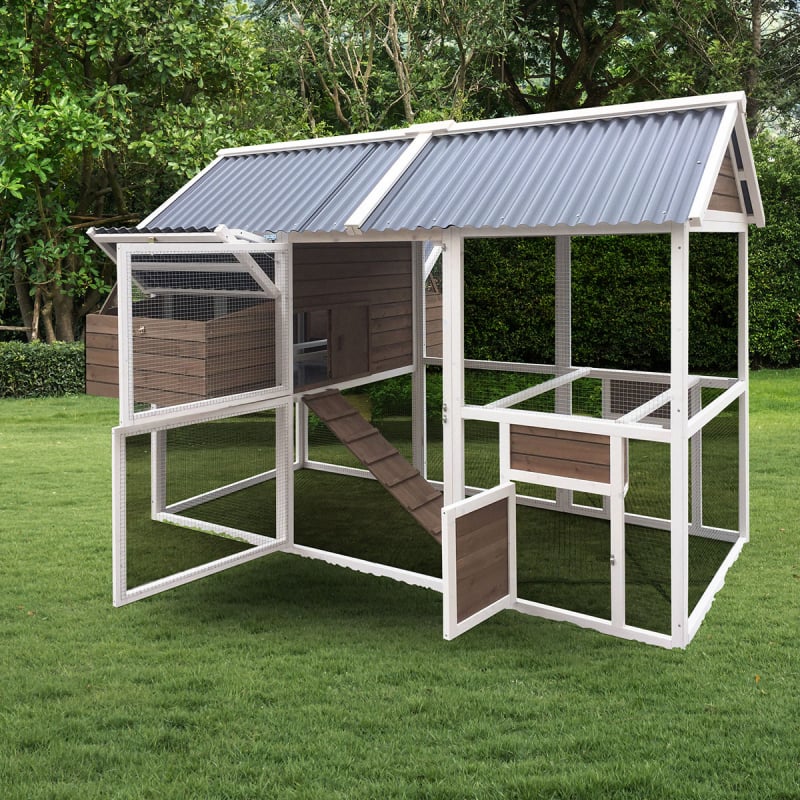 Dotato di una rampa in legno che dà accesso al primo livello dove le vostre galline avranno uno spazio intimo con posatoio e nido. Il tetto in PVC offre una resistenza alle intemperie più importante nel tempo.