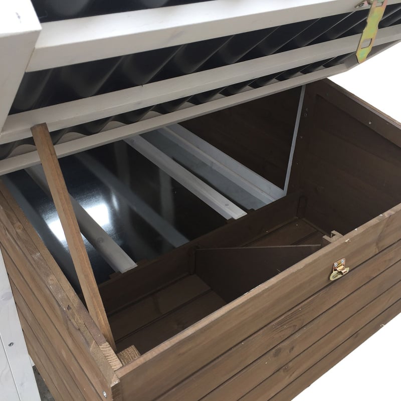 Due spazi per nidificare sono situati al 1° livello facilmente accessibili tramite una rampa per offrire un angolo accogliente alle vostre galline dove deporre le loro uova in tranquillità. Ogni nido dispone di 2 spazi delimitati per offrire la necessaria intimità alle vostre galline in un luogo accogliente sia per deporre che per covare in calma. Un tetto sollevabile situato sopra ogni nido vi permetterà di avere accesso alle uova facilmente e di permettere una pulizia efficace
