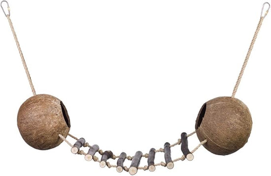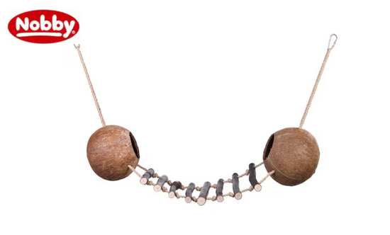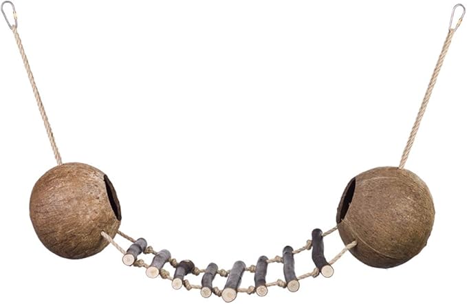Questo gioco attivo è composto da due noci di cocco con aperture, corde in sisal e pioli in legno, ed è adatto sia per uccelli che per roditori. Il gioco è lungo 90 cm. La naturale curiosità del tuo animale domestico richiede varietà e accessori stimolanti per la gabbia. Questo gioco attivo è realizzato con materie prime naturali e si fissa facilmente alla gabbia.