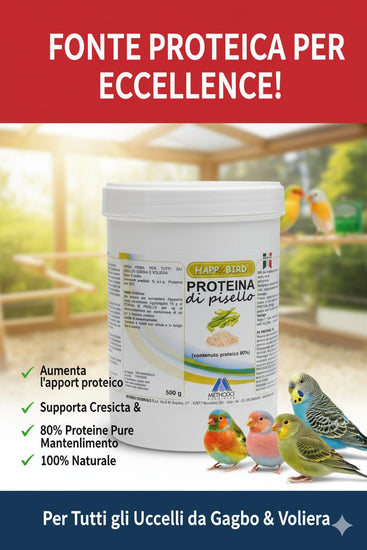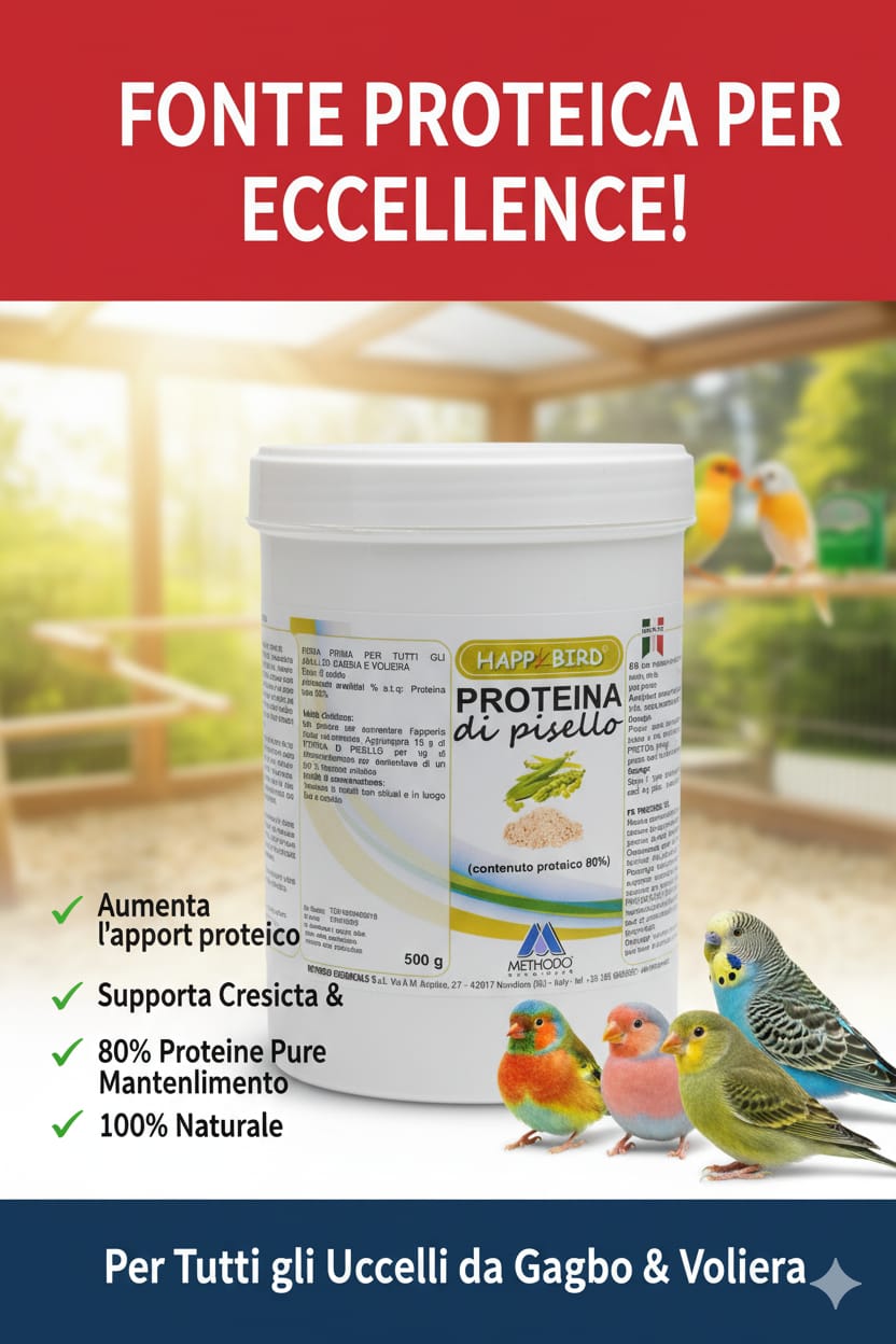 è stata appositamente formulata per soddisfare le esigenze nutrizionali degli uccelli, fornendo loro le proteine necessarie per una crescita sana e un piumaggio lucente. Facile da miscelare con il loro cibo abituale, la Proteina di Piselli Happy Bird è un'aggiunta naturale e nutriente alla loro dieta. Disponibile in una confezione da 500gr, questo prodotto è una scelta eccellente per gli amanti degli uccelli che desiderano offrire il meglio ai loro amici pennuti. NON CREA DORATURE