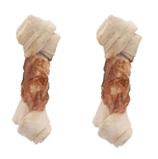 Osso annodato di pelle bovina con pollo da masticare, spuntino-ricompensa senza conservanti ne coloranti