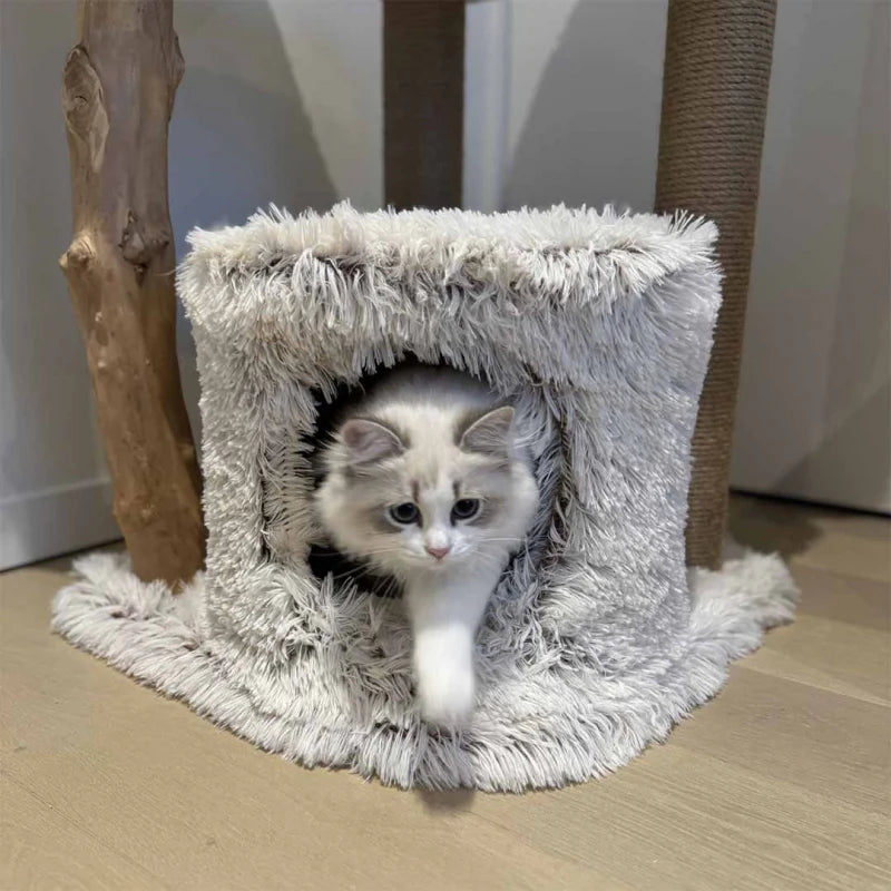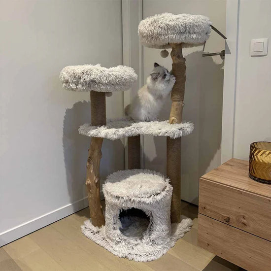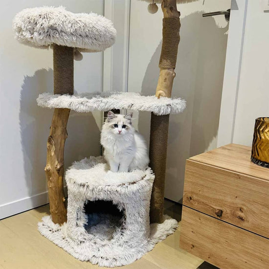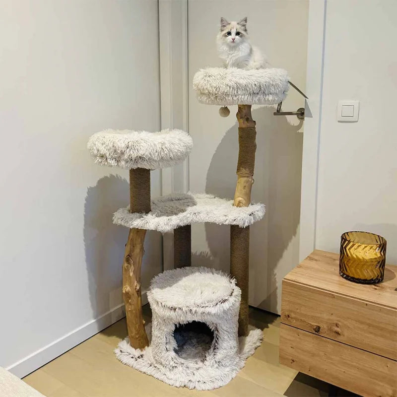- 49x49x122cm - Beige - Per gatti di tutte le taglie - Struttura in legno naturale - Peluche lungo e morbido - Dispone di una cuccia per riposare - Cestini comodi - Pali in juta resistenti - Palline da gioco con campanellini - Materiali naturali - Design elegante - Robusti tiragraffi - Morbida area di riposo - Tiragraffi unico
